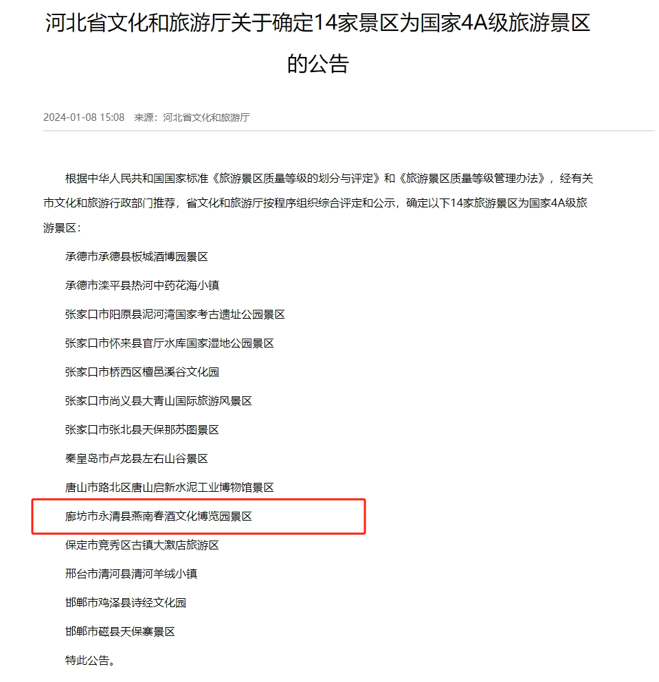 2024年1月8日,河北省文化和旅遊員紙廳公示,燕南春酒文化博覽園被(bèi)确定爲國(guó)家4A級微個景區。